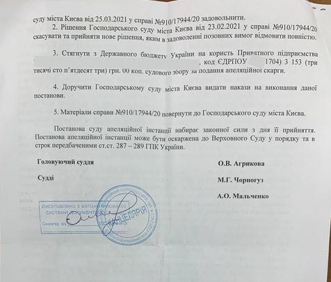 Судом апелляционной инстанции наши доводы были приняты во внимание, были подробно проанализированы все доказательства и обстоятельства дела и обжалуемое решение суда первой инстанции было отменено и принято новое решение, которым в удовлетворении иска Регионального отделения Фонда государственного имущества Украины по городу Киеву об взыскании неустойки по договору аренды было отказано. Верховный Суд, после обжалование указанного решения суда апелляционной инстанции, также вынес решение в пользу нашего клиента. Копия постановления апелляционного суда прилагается ниже.