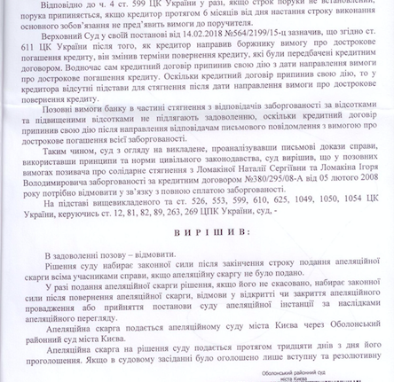 Приклад рішення суду про відмову банку у стягненні кредиту